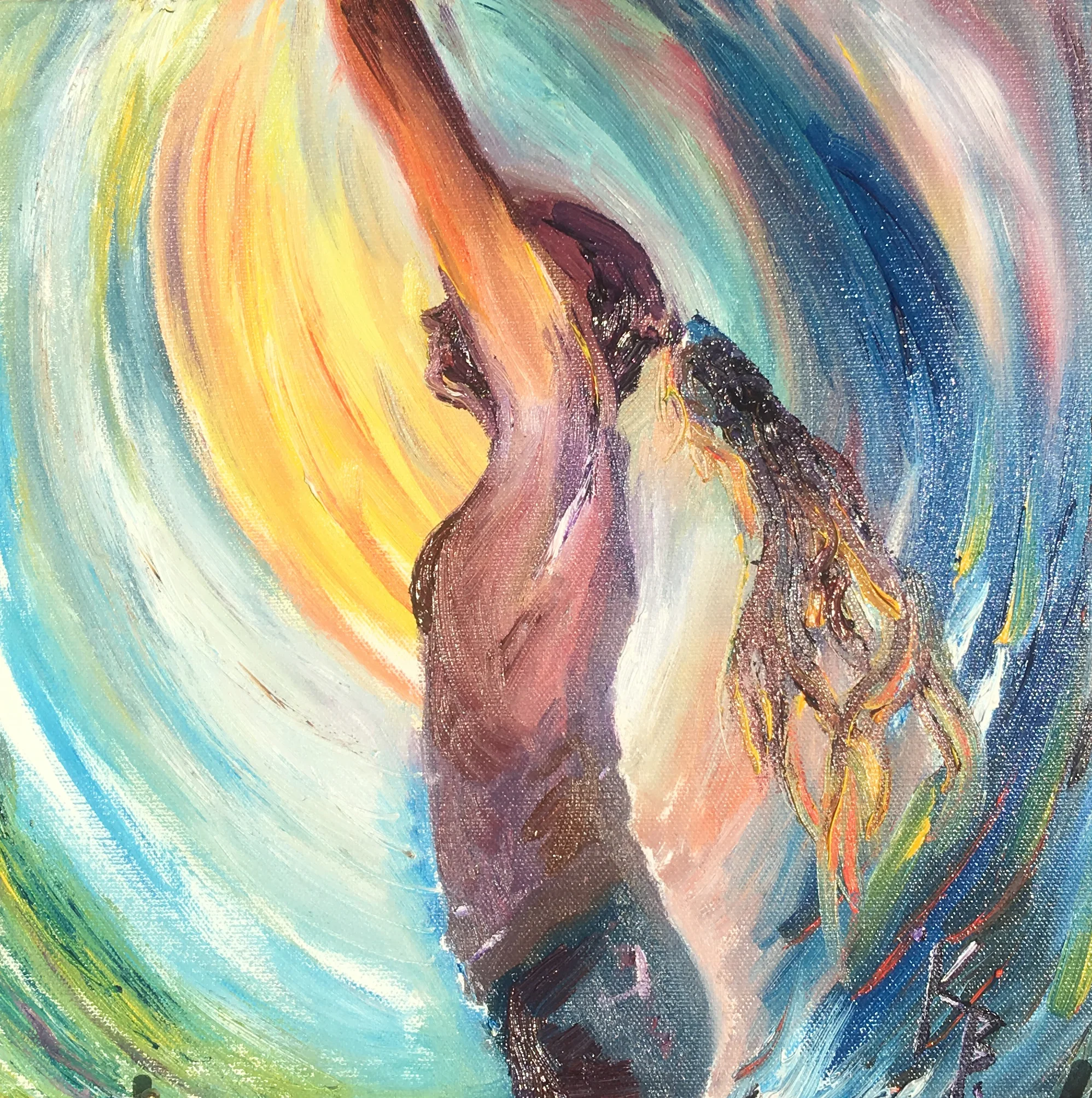 This early painting is an interpretation of one of my favorite artist's work. Gustav Klimt's "The Kiss" flattens plains and uses dynamic texture with gold