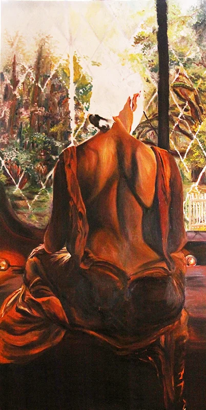 The photos and the original sculpture are the foundation that allowed for all I needed to grow into myself, and to arrive at the space to make my current painting. It is a self-portrait that is a declaration of my identity as an artist. It has been a meditation in returning to myself. I show my seated figure from the back looking out the window with leaded glass panes at the great tree across the lawn. The dark shading and shadows allow for a depth and evoke themes of the feminine force, like yang in the Tao. Receptivity, gravity, stillness. I found this to be the evocation of the work, through the image and the process of creating it, in the contemplation of each brush stroke. The most important elements to me are the components the viewer does not see, the invisible connections. The psychology of connection and past history that my seated self has to the tree, the life stories her gaze holds, a gaze that is suggested but not seen. I find this important because I feel that by keeping mystery and not seeing the face the viewer must wonder about the person before them, and this is a more accurate portrait than a posed smile. A snap-shot picture does not show the essence of a person, but often we feel as though we can know someone by seeing them this way. I found this removed view yields a different light. Who is this person? Expectations cannot reach to the truth of essence. The reality of the Self is found in a being-ness that is present and beyond definition.