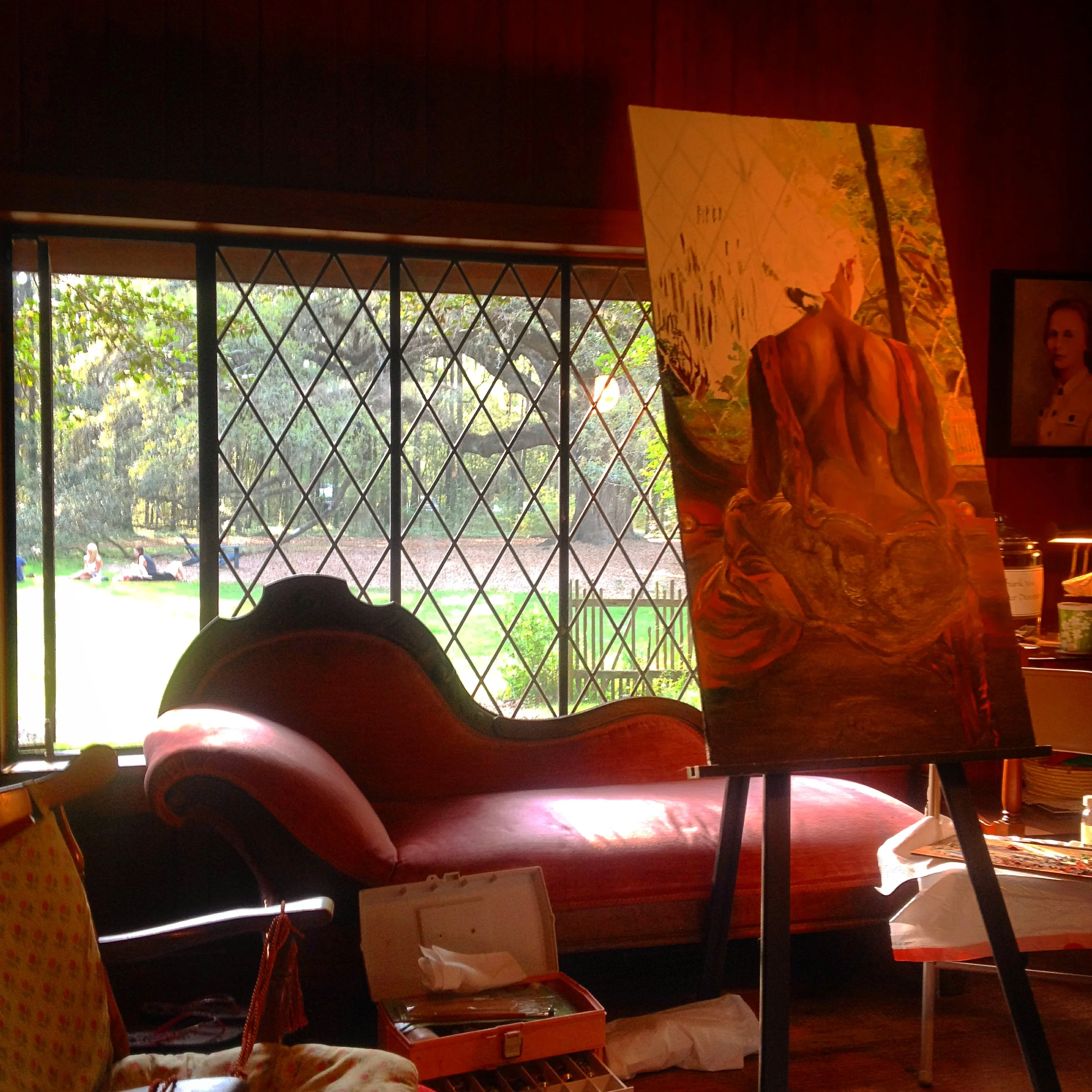 This painting is part of an artist residency experience at the Lichgate on High Road. It is to be finished at my return to Tallahassee for the conclusion of the "Rain the Blessings Down" crystal installation which hangs from the rafters of the historic cottage.