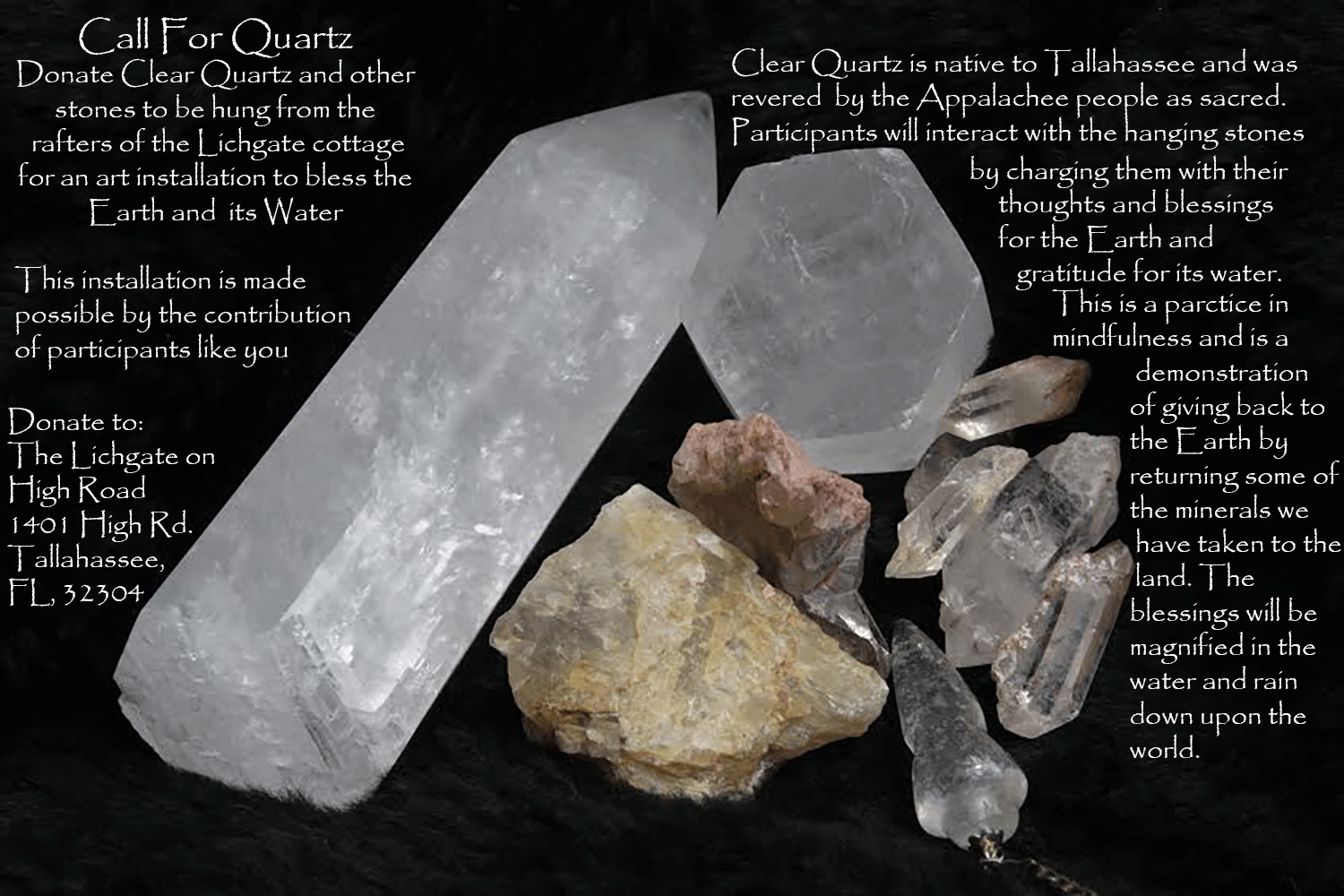 I asked local groups and community members to donate clear quartz which is native to the hills of Tallahassee. When I lived in Tallahassee I worked as an historical interpreter at Mission San Luis, the only year round living history museum in Florida. My time there made me aware of certain history of the Appalachee tribe of Florida. The Appalachee revered clear quartz and believed it had spiritual properties. The most significant artifact excavated on the grounds is said to be the quartz crystal cross, which shows the blending of Spanish and tribal cultures. I felt it was important to return the native stone to the land for this project.