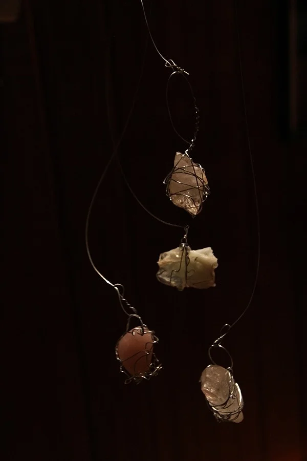 By having the quartz hang above us suspended like rain droplets they are placed in the level of our thoughts, where they can pick up our thought patterns and make us become conscious of the power of what we think. Like a dream catcher these thought collectors are uplifting to the eye and the mind. It is a beautiful manifestation that represents our impact on the world- through the object of stone which was extracted by human hands, and now given back by human hands, through the power of energetic impression of our thought, through the connection to community, and the representation of far reaching implications to our environment by water and by land.
